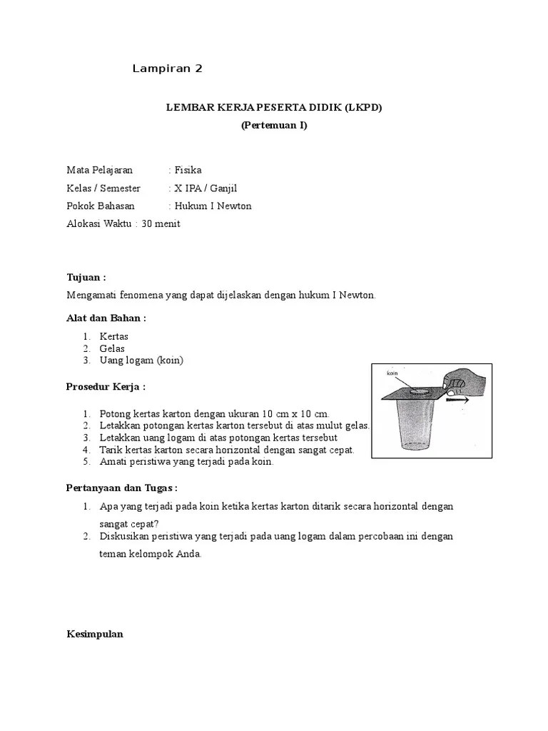 Siswa dapat menjelaskan pengertian hukum 1 newton melalui mengamati dengan melakukan percobaan. Dasar teori percobaan ini adalah hukum newton 1 tentang inersia / kelembaman. Terhadap keterampilan ilmiah siswa pada konsep hukum newton kelas x. Isilah air ke dalam gelas, kemudian masukkan pensil. Bagaimana keadaan gelas pada saat kertas ditarik secara perlahan?
